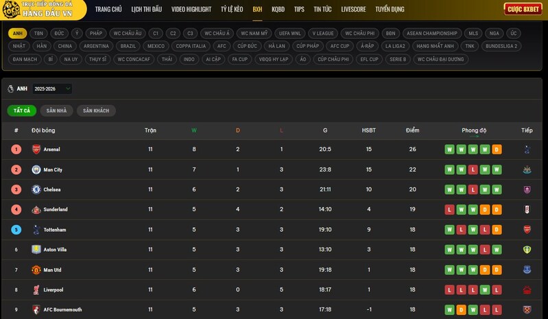 - Bảng xếp hạng và lịch thi đấu: Theo dõi vị trí các CLB, phong độ cầu thủ cùng lịch thi đấu chi tiết từng ngày, từng giải, đặc biệt là bảng xếp hạng bóng đá ngoại hạng anh.